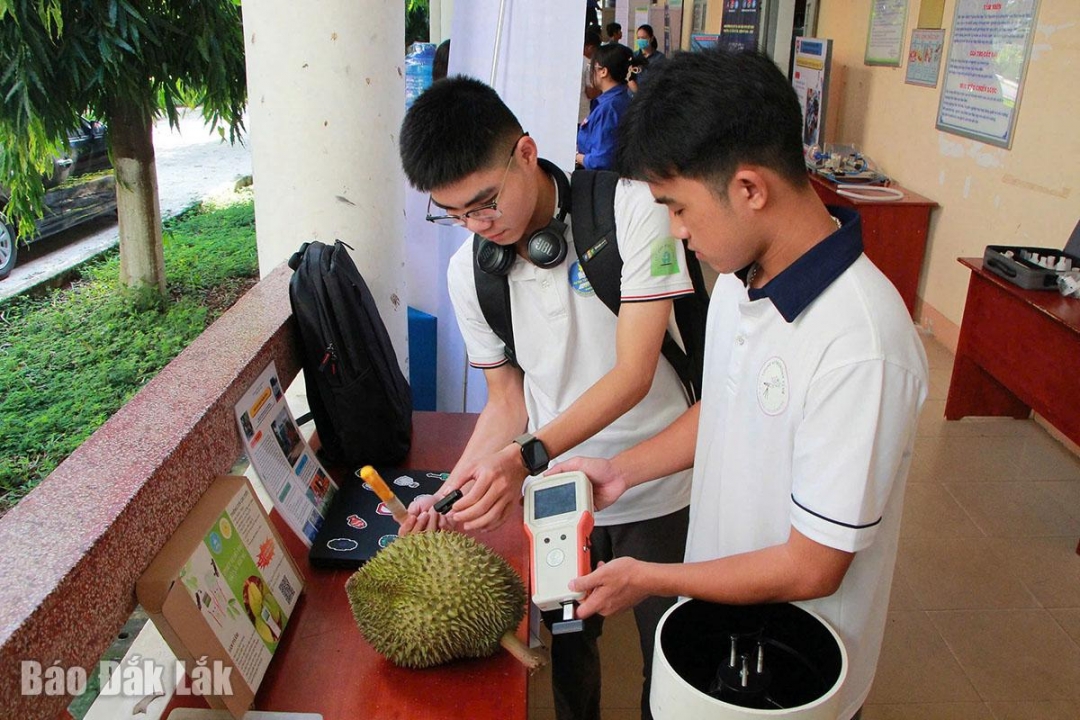 Tiêu biểu như sản phẩm Thiết bị hỗ trợ gõ sầu riêng của nhóm sinh viên: Hoàng Ngọc Trung Nguyên, Trần Thị Hồng Nhung, Nguyễn Võ Ngọc Hiệp, Nguyễn Thị Huyền Trinh, Đinh Trung Đức (ngành Sư phạm vật lí, Khoa Khoa học tự nhiên và công nghệ, Trường Đại học Tây Nguyên). Trung Nguyên chia sẻ, nhận thấy mỗi năm gia đình phải tốn khá nhiều tiền cho việc thuê nhân công gõ sầu riêng, em đã nảy sinh ý tưởng làm ra một loại máy có thể xác định mức độ chín của sầu riêng và cùng nhóm bạn bắt tay vào nghiên cứu thực hiện.
