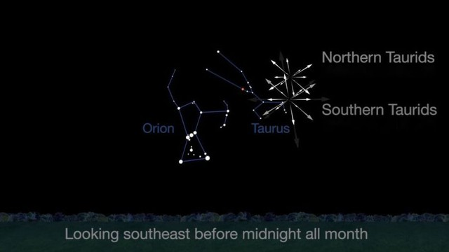 Bản đồ điểm phát ra mưa sao băng Bắc Taurids (Northern Taurids) và Nam Taurids (Southern Taurids) - Ảnh đồ họa: NASA