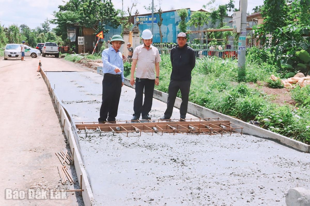 Chủ tịch UBND huyện Cư Kuin Võ Tấn Huy (bìa trái) kiểm tra việc thi công dự án đường liên xã Ea Bhốk - Ea Ning