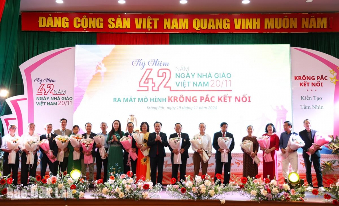 Lãnh đạo huyện Krông Pắc tặng hoa chúc mừng và tri ân các thầy, cô giáo tiêu biểu của ngành giáo dục huyện qua các thời kỳ