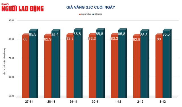 Tại Việt Nam, giá vàng SJC cuối ngày 3-12 bán ra 85,5 triệu đồng/lượng. Giá vàng nhẫn 84,2 triệu đồng/lượng.
