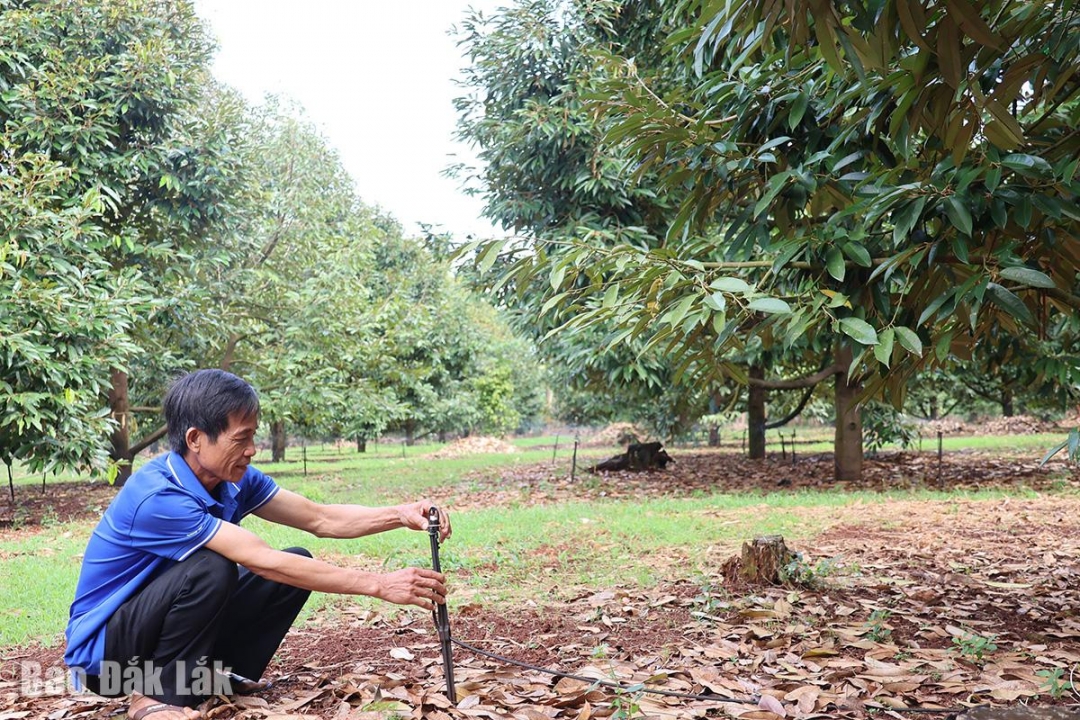Sau đó định hình mô hình sản xuất theo diện tích đất sẵn có; lựa chọn giống sầu riêng Dona để trồng thâm canh (không trồng xen nhằm hạn chế nhiễm sâu bệnh chéo giữa các cây trồng trong vườn). Năm 2021, sau vụ thu hoạch sầu riêng đầu tiên, gia đình ông đã đầu tư lắp đặt hệ thống tưới tự động, giúp chủ động và tiết kiệm thời gian tưới nước, bón phân (bón phân qua hệ thống tưới). Ông còn nuôi cỏ và giữ cỏ trên vườn sầu riêng để chống nóng, chống hạn mùa khô sắp tới.