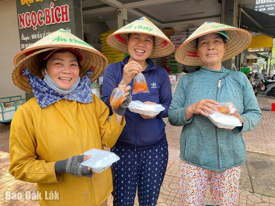 Cầm suất cơm ấm nóng trên tay, bà Nguyễn Thị Hương (phường Thành Công, TP. Buôn Ma Thuột) chia sẻ, chồng mất sớm, bản thân lại mắc bệnh viêm khớp, bà không thể lao động nặng nhọc như trước. Các con giờ đã trưởng thành, có gia đình và cuộc sống riêng nhưng cũng không khá giả gì. Bà không muốn là gánh nặng cho con cái nên hằng ngày đi thu mua ve chai để tự lo cho bản thân. Tình cờ biết được bếp cơm chay “0 đồng” nên thi thoảng bà ghé vào nhận cơm miễn phí. “Những món ăn chay ở đây rất ngon, phù hợp với khẩu vị của tôi. Nhờ bếp ăn này đã giúp tôi tiết kiệm chi phí, dành dụm để lo thuốc men cho bản thân”, bà Hương tâm sự.