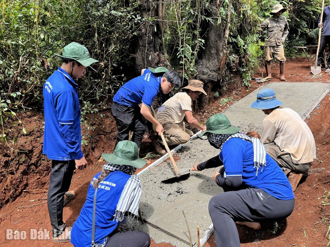Đoàn xã Cư Pơng (huyện Krông Búk) phối hợp với chiến sĩ tình nguyện Mùa hè xanh Trường Đại học Tây Nguyên làm đường xuống bến nước buôn Kđoh