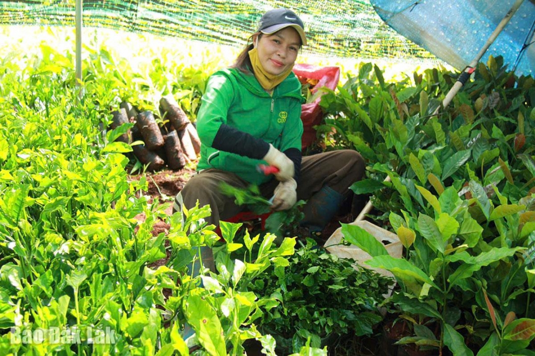 Chị Nguyễn Thị Thừa ở thôn 7 (xã Ea Tiêu, huyện Cư Kuin) đến xã Hòa Thắng làm việc tại một vườn ươm cây trồng