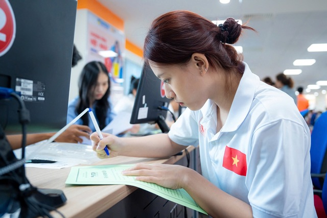 Sinh viên nộp hồ sơ nhập học tại một trường ngoài công lập ở TP HCM. Ảnh: HUY LÂN