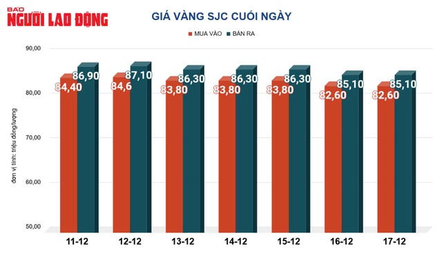 Tại Việt Nam, giá vàng miếng SJC ngày 17-12 được các ngân hàng bán ra 85,1 triệu đồng/lượng. Công ty SJC bán ra vàng nhẫn với giá 84,3 triệu đồng/lượng.