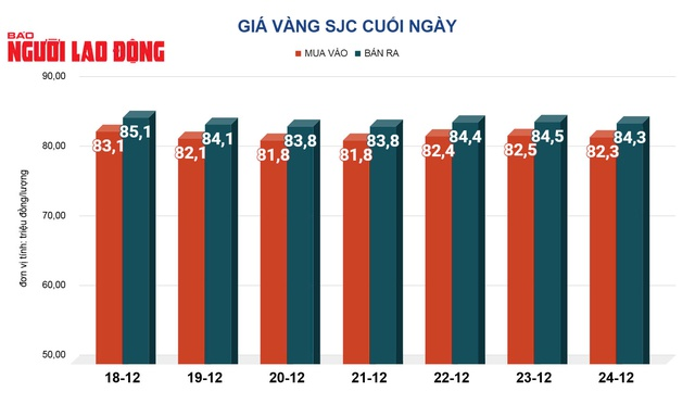 Tại Việt Nam, giá vàng SJC cuối ngày 24-12 được các ngân hàng bán ra 84,3 triệu đồng/lượng. Công ty SJC bán ra vàng nhẫn với giá 84,1 triệu đồng/lượng.