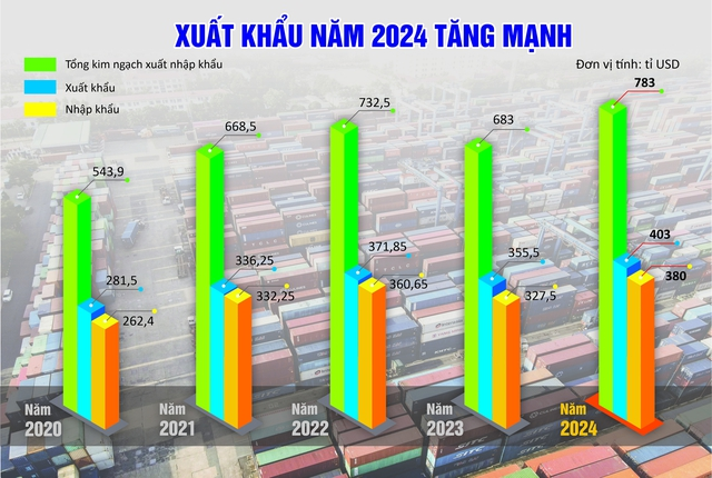 Theo công bố của Bộ Công Thương, xuất khẩu (XK) năm 2024 lập kỳ tích mới, ước đạt 403 tỉ USD; nhập khẩu (NK) ước đạt 380 tỉ USD. Cán cân thương mại duy trì xuất siêu ở mức cao, khoảng gần 25 tỉ USD, ghi nhận xuất siêu năm thứ 9 liên tiếp.