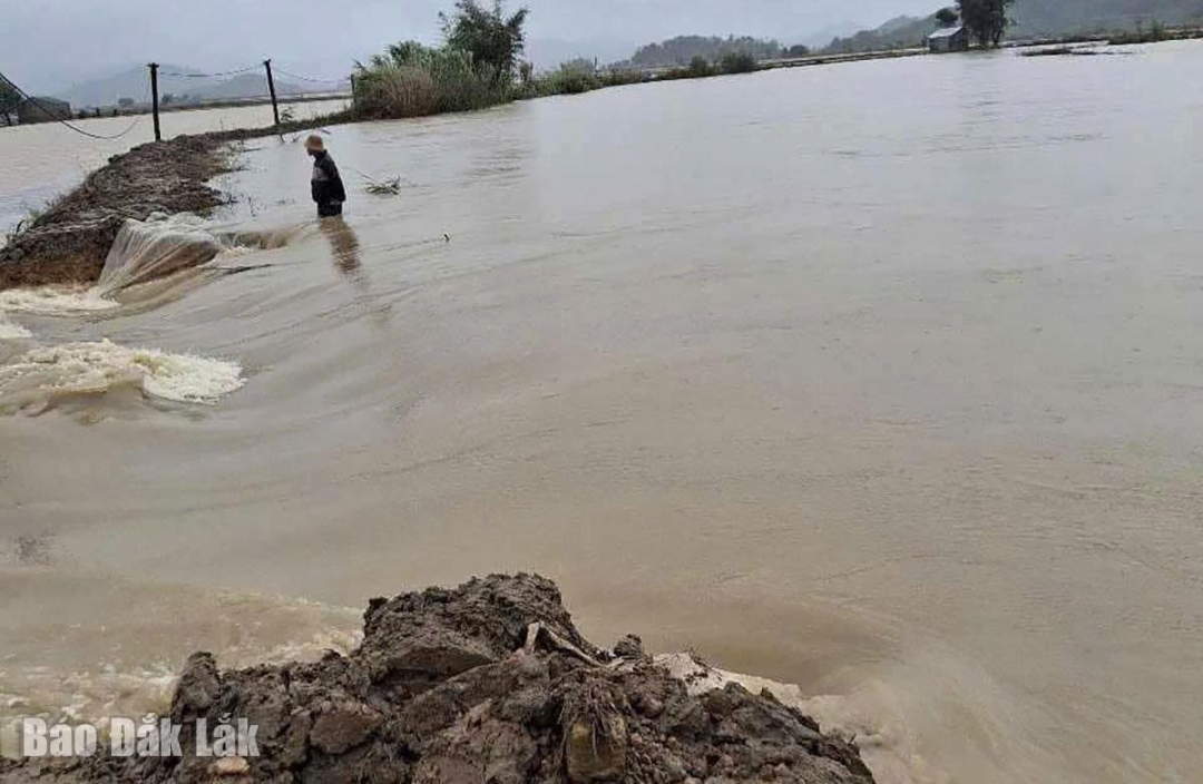 Theo UBND xã Buôn Triết (huyện Lắk), do ảnh hưởng đợt mưa những ngày vừa qua và nước từ thượng nguồn đổ về, trên địa bàn xã có một đoạn đê bao và tuyến đường liên thôn bị sạt lở, gây ngập 6 ha lúa gieo sạ sớm và 2 ha khoai lang. Cụ thể, công trình đê bao ngăn lũ phía Nam sông Krông Ana bị sạt lở một số đoạn (do nước đang cao nên chưa có thống kê về chiều dài vị trí sạt lở). Bên cạnh đó, một đoạn bờ sông Krông Ana cũng bị sạt lở, với chiều dài 30 m (tại vị trí này, tháng 8/2023 cũng bị sạt lở, sau đó được địa phương khắc phục tạm thời).