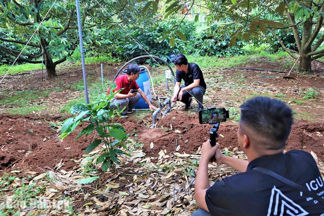 Nông dân ứng dụng công nghệ để live stream (phát trực tiếp) chia sẻ phần mềm sản xuất mới tại vườn sầu riêng xã Ea Kênh (huyện Krông Pắc)