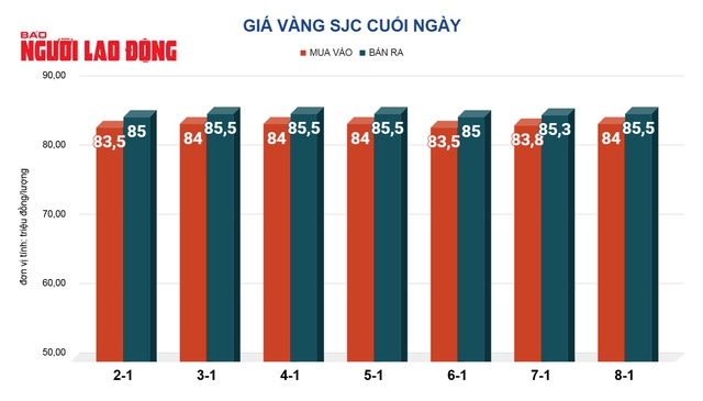 Trước đó, tại Việt Nam, thị trường vàng ngày 8-1 biến động không đáng kể. Giá vàng SJC cuối ngày được các ngân hàng bán ra 85,5 triệu đồng/lượng. Công ty SJC bán ra vàng nhẫn với giá 85,3 triệu đồng/lượng.