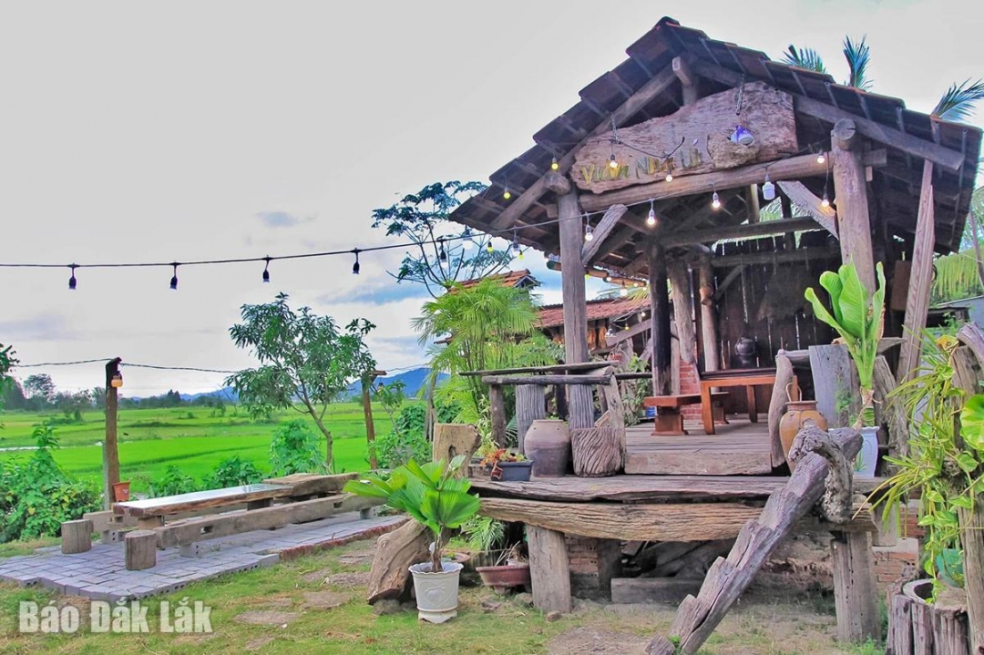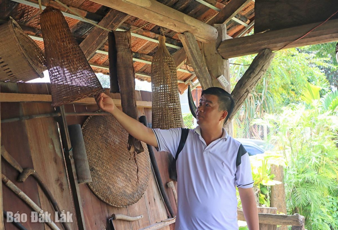 Cứ thế, mỗi lần vào buôn, anh thường bỏ tiền ra để mua lại những vật dụng mà người M’nông nơi đây không dùng đến. Sau thời gian dài, nhà của anh chất đầy vật dụng từ nia, chóe, cuốc, xẻng, bầu khô… Những thứ đơn sơ, bình dị ấy được anh coi là “báu vật” nên anh tìm mua gỗ dựng nhà sàn trên mảnh đất nhỏ của gia đình tại buôn Lê (thị trấn Liên Sơn) để có nơi cất giữ và tái hiện lại không gian sinh hoạt, đời sống mang đậm bản sắc người M’nông. Ban đầu, anh chỉ định thiết kế ra để cuối tuần hay những lúc rảnh rỗi rủ người thân, bạn bè cùng đến thư giãn. Dần dà, được nhiều người yêu thích nên anh đã nảy ra ý tưởng làm dịch vụ kinh doanh từ không gian này để vừa có thêm kinh phí duy trì việc bảo tồn, vừa làm “cầu nối” cho người dân và du khách khám phá văn hóa truyền thống người bản địa.