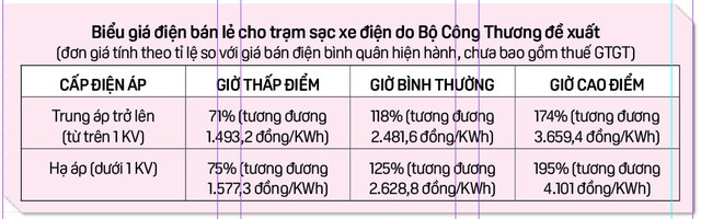 Theo cơ quan soạn thảo, nếu áp dụng giá điện cho trạm sạc theo giá điện sản xuất, khách hàng sẽ trả ít hơn chi phí thực tế gây ra cho hệ thống điện từ 552 - 699 đồng/KWh, tùy cấp điện áp. Còn nếu áp dụng theo giá điện kinh doanh, số tiền điện khách hàng phải trả sẽ nhiều hơn chi phí thực tế gây ra cho hệ thống khoảng 467 - 587 đồng/KWh, tùy cấp điện áp. Hơn nữa, việc áp dụng 1 trong 2 phương án này sẽ tiếp tục làm phát sinh bù chéo giữa các nhóm khách hàng sử dụng điện, không phù hợp với chủ trương trong Nghị quyết 55/2020 của Bộ Chính trị về định hướng chiến lược phát triển năng lượng quốc gia của Việt Nam đến năm 2030, tầm nhìn đến năm 2045.