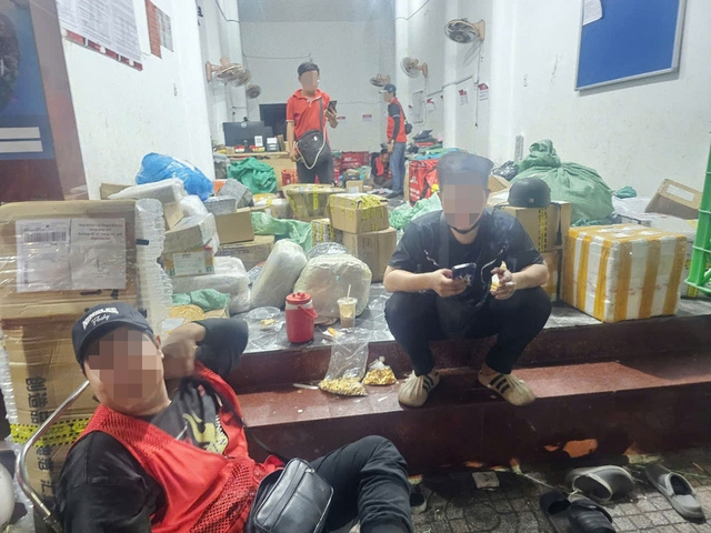 Một trạm giao hàng ở trung tâm TP HCM quá tải đơn hàng dù đã tối muộn. Ảnh: LÊ TỈNH