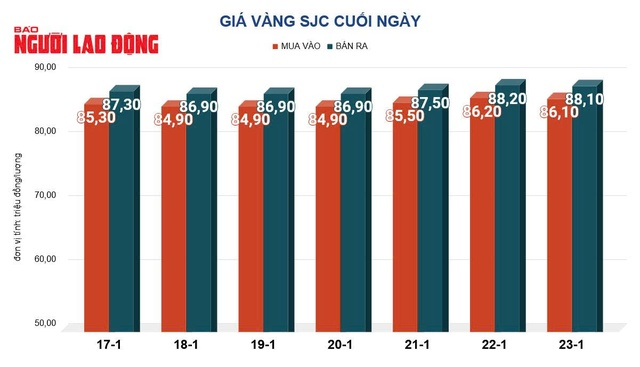 Trước đó, tại Việt Nam, giá vàng SJC cuối ngày 23-1 được các ngân hàng bán ra 88,1 triệu đồng/lượng. Công ty SJC bán ra vàng nhẫn với giá 87,8 triệu đồng/lượng.