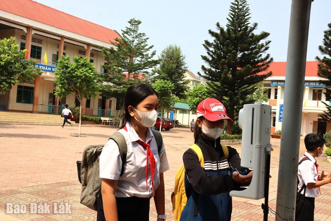 Học sinh tại TP. Buôn Ma Thuột chủ động đeo khẩu trang và sát khuẩn tay để tránh các bệnh về hô hấp