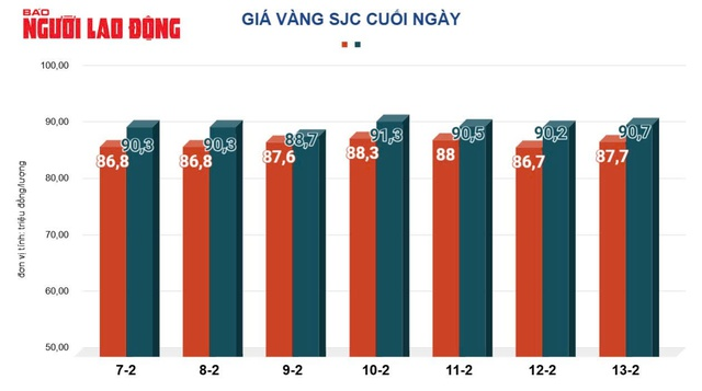 Tại Việt Nam, cuối ngày 13-2 giá vàng SJC bán ra lên tới 90,7 triệu đồng/lượng. Giá vàng nhẫn 90,5 triệu đồng/lượng.