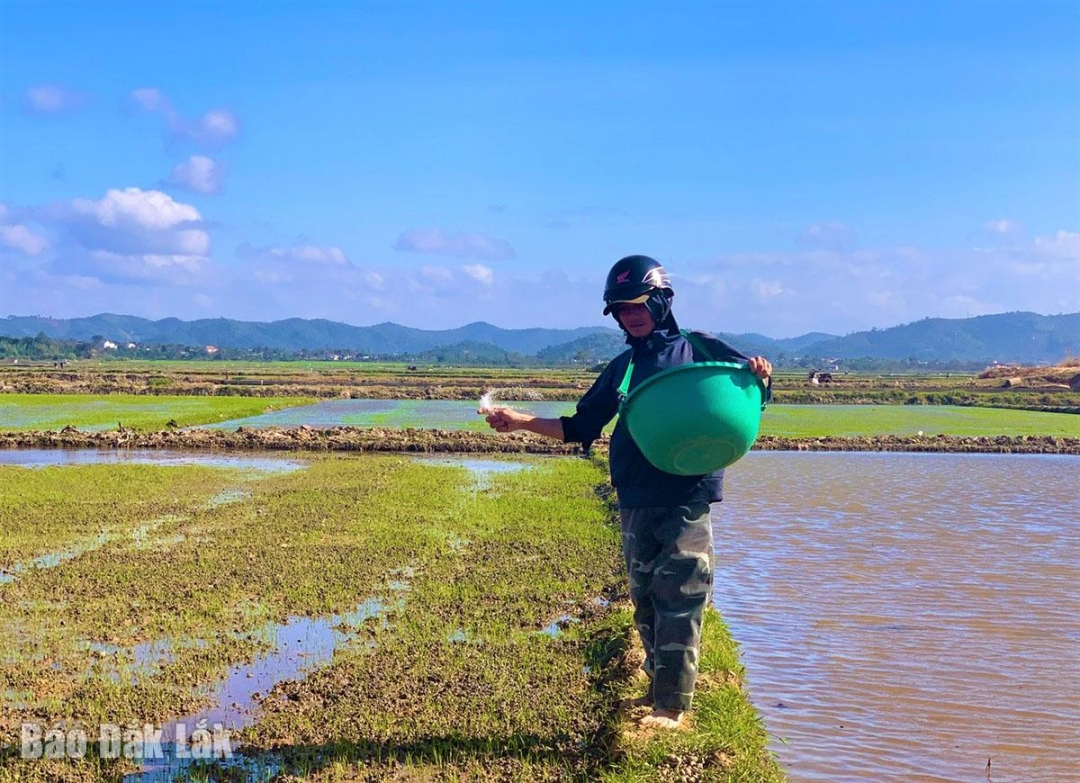 Ông Lê Văn Giảng (thôn 2, thị trấn Buôn Trấp, huyện Krông Ana) bón phân cho lúa