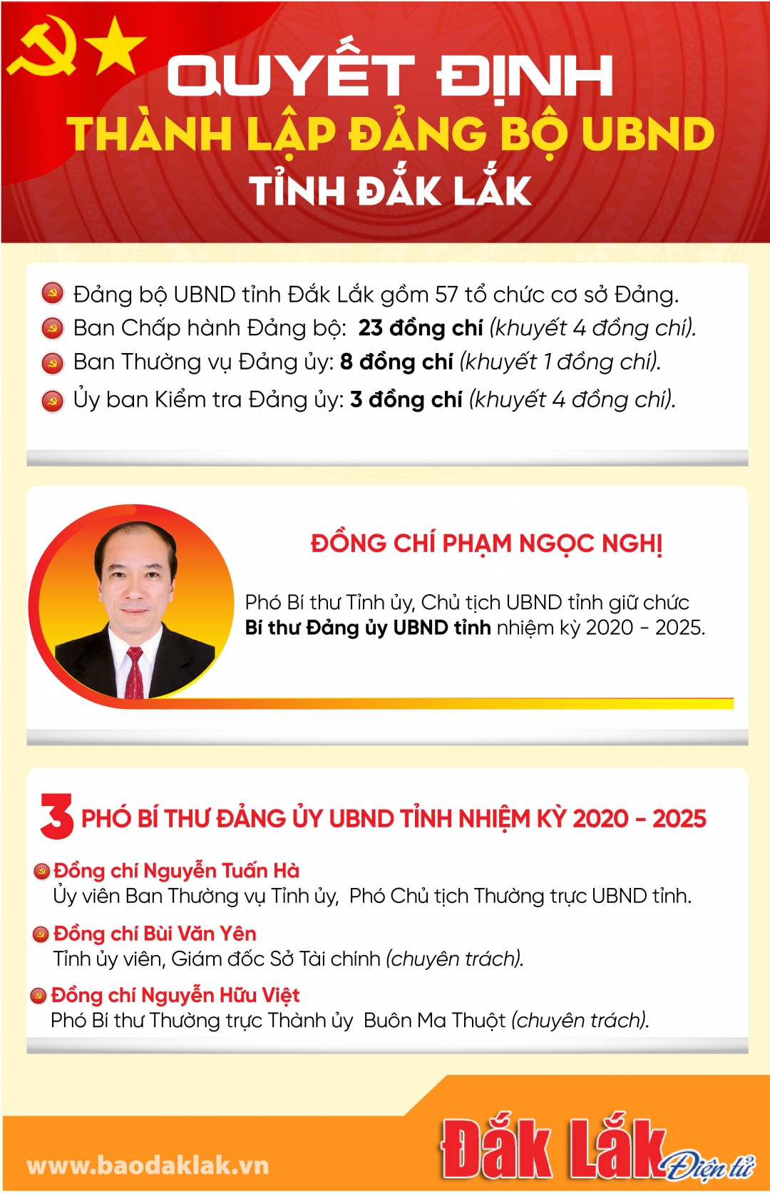 Tỉnh ủy Đắk Lắk đã ban hành Quyết định số 2197-QĐ/TU về việc thành lập Đảng bộ UBND tỉnh Đắk Lắk, trực thuộc Tỉnh ủy, gồm 57 tổ chức cơ sở Đảng, kể từ ngày 1/3/2025.
