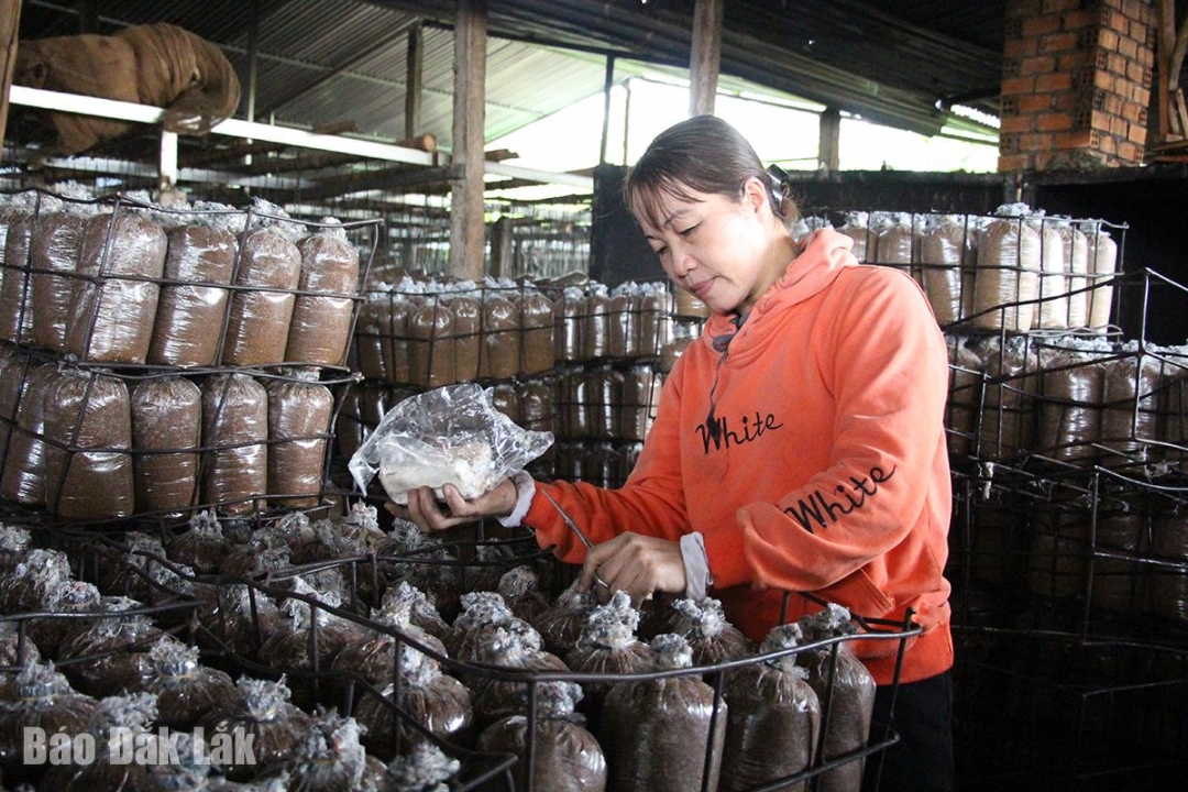 Được sự hỗ trợ, giới thiệu của hội LHPN tại địa phương, chị Đoàn Thị Lan (xã Quảng Điền, huyện Krông Ana) đã theo học nghề và xây dựng cơ sở trồng nấm tại gia đình. Tận dụng các phụ phẩm nông nghiệp có sẵn tại địa phương như rơm, cám, chị thử nghiệm trồng các loại nấm như nấm rơm, bào ngư, linh chi. Không chỉ phát triển kinh tế hộ, hiện tại mô hình của gia đình chị đang tạo việc làm thường xuyên cho 5 lao động nữ tại địa phương với mức thu nhập từ 4,5 - 6 triệu đồng/người/tháng.