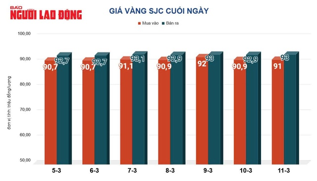 Trước đó, tại Việt Nam, cuối ngày 11-3, giá vàng SJC bán ra 93 triệu đồng/lượng. Giá vàng nhẫn 92,9 triệu đồng/lượng.