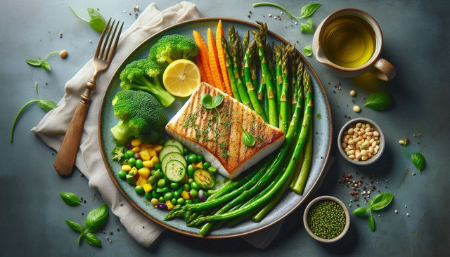 Nghiên cứu từ Anh cho thấy các món ăn như cá, rau và đậu sẽ giúp não bộ của bạn giữ được sự khỏe mạnh - Minh họa AI: Thu Anh