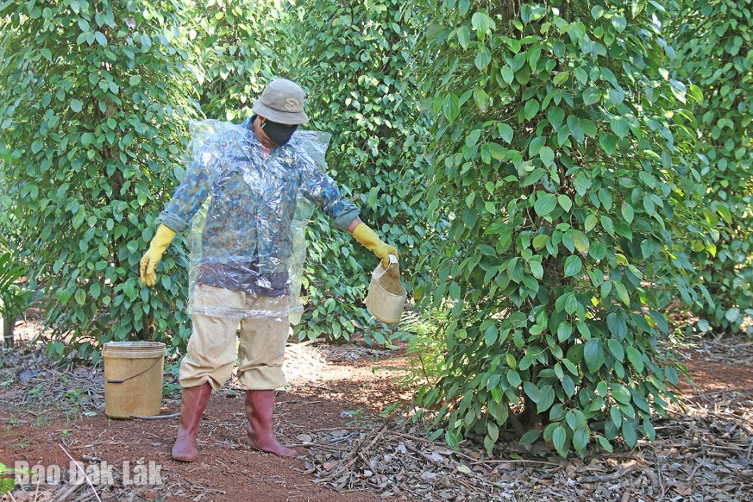Tương tự, phân bón vi sinh dần trở thành lựa chọn hàng đầu, thay thế thuốc bảo vệ thực vật trong vườn tiêu của gia đình ông Vũ Kim Thịnh (thôn Kim Châu, xã Dray Bhăng). Theo ông Thịnh, hồ tiêu là cây trồng khó tính, không chịu được ngập úng nhưng lại rất cần nước. Vì vậy, gia đình ông chỉ phát cỏ quanh gốc vào mùa mưa để phòng ngừa bệnh tuyến trùng, còn vào mùa nắng không phát cỏ để giữ ẩm cho đất.