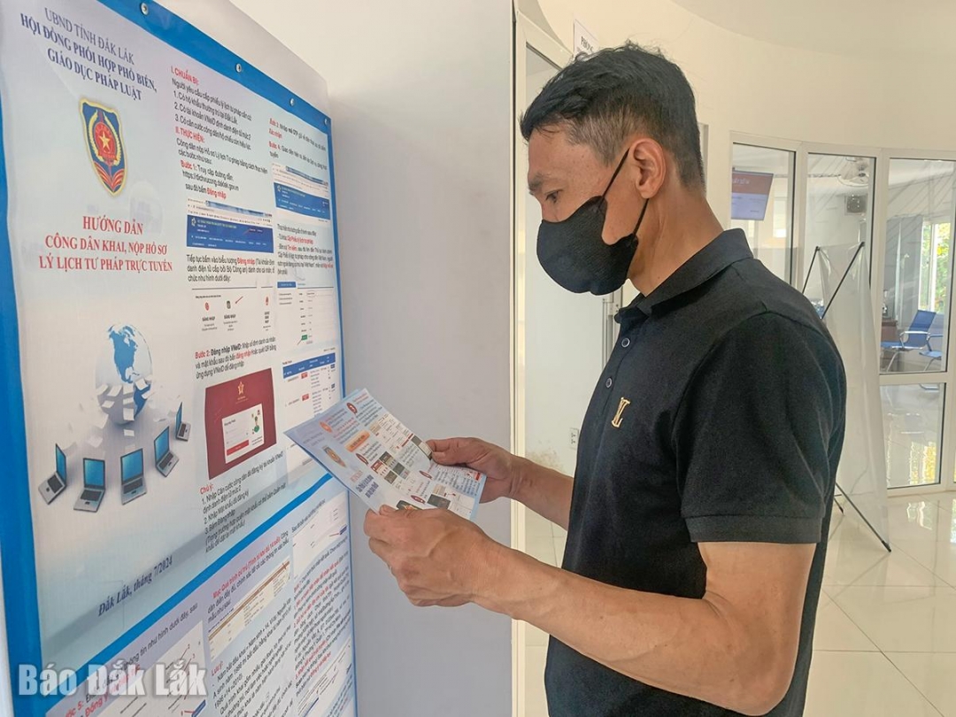 Người dân tìm hiểu thông tin từ tờ rơi hướng dẫn cấp phiếu lý lịch tư pháp trực tuyến