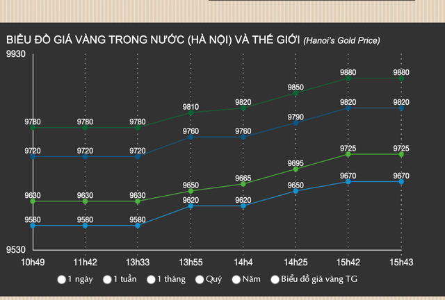 Tuy nhiên, chỉ sau vài phút mở cửa giao dịch, Bảo Tín Minh Châu tiếp tục đẩy giá vàng miếng và vàng nhẫn 24K của công ty này lên mức kỷ lục mới, 99,2 triệu đồng/lượng bán ra và 97,65 triệu đồng/lượng mua vào.