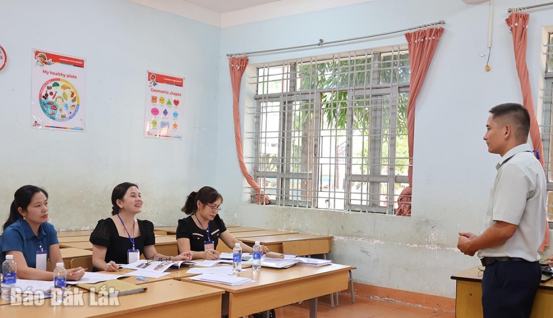 Ban giám khảo góp ý cho thí sinh về việc vận dụng phương pháp dạy học tích cực tại Hội thi giáo viên dạy giỏi cấp Tiểu học tỉnh Đắk Lắk, năm học 2024 - 2025
