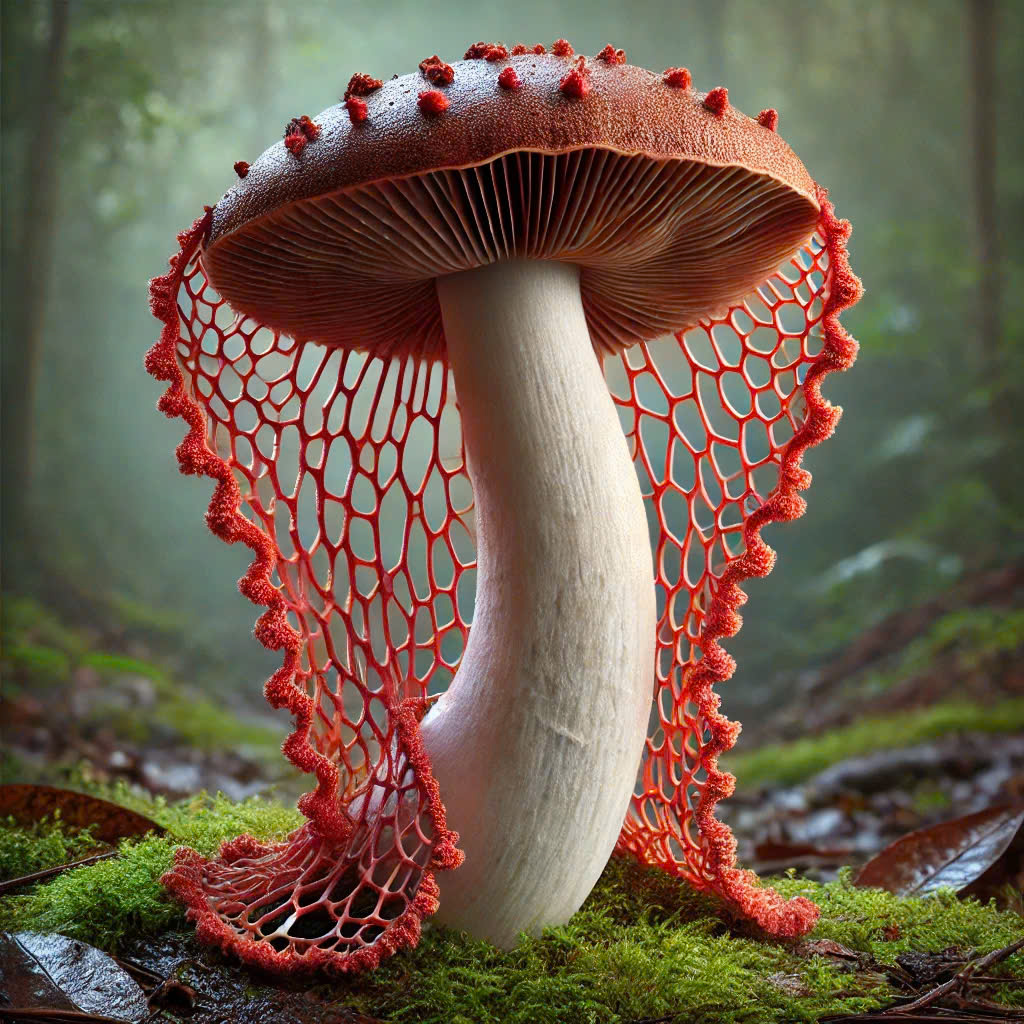 Hình ảnh mô phỏng nấm lưới đỏ (Dictyophora indusiata) – một loại nấm có hình dạng lưới đặc trưng và thường mọc ở các khu vực nhiệt đới.