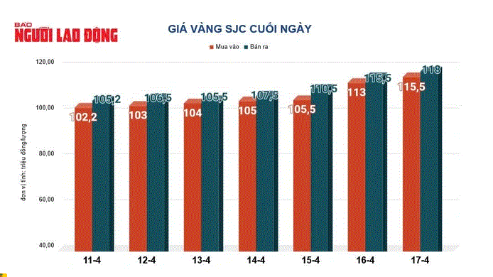 Cụ thể, cuối ngày 17-4, giá vàng miếng SJC bán ra đạt 118 triệu đồng/lượng, tăng đáng kể so với các phiên trước. Giá vàng nhẫn ở mức 117 triệu đồng/lượng, cũng ghi nhận xu hướng tăng.