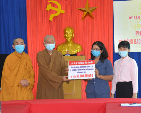Đại diện Ban Trị sự Phật giáo Việt Nam tỉnh trao kinh phí ủng hộ đồng bào bị ảnh hưởng bởi hạn hán, xâm nhập mặn