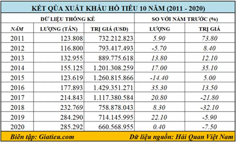 Bảng kết quả xuất khẩu tiêu của nước ta trong 10 năm (từ 2011 đến 2020)