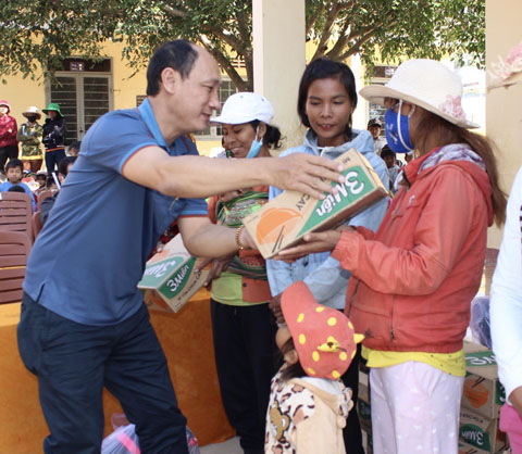 Đại diện công an phường 11 (quận Bình Thạnh, TP. Hồ Chí Minh) tặng quà cho người dân xã Hòa Hiệp.