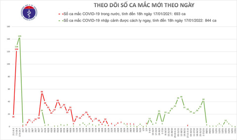 Bộ Y tế cho biết ngày 17-1 Việt Nam không phát hiện ca bệnh Covid-19 sau nhiều tuần liên tục ghi nhận các ca bệnh là người nhập cảnh. Đến nay, số ca mắc Covid-19 ở Việt Nam là 1.537 người trong đó 693 ca mắc Covid-19 do lây nhiễm trong nước, 844 ca bệnh nhập cảnh.