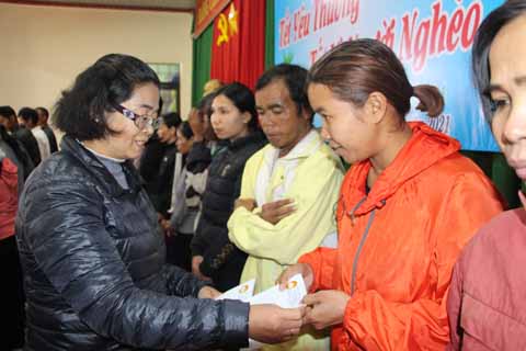 Đồng chí H’Kim Hoa Byă, Ủy viên Ban Thường vụ Tỉnh ủy, Trưởng Ban Dân vận Tỉnh ủy, Chủ tịch Ủy ban MTTQ Việt Nam tỉnh trao quà tặng các hộ nghèo.