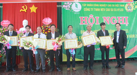 Đại diện Tập đoàn Công nghiệp Cao su Việt Nam trao tặng Bằng khen của Tập đoàn cho các tập thể của Công ty TNHH MTV Cao su Ea H’leo.