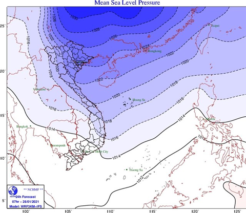 Từ sáng nay (28/1), bộ phận không khí lạnh này sẽ ảnh hưởng đến các tỉnh vùng núi phía Bắc của Bắc Bộ, chiều và tối ảnh hưởng đến các nơi khác ở Bắc Bộ, Bắc Trung Bộ sau đó ảnh hưởng một số nơi ở Trung Trung Bộ.