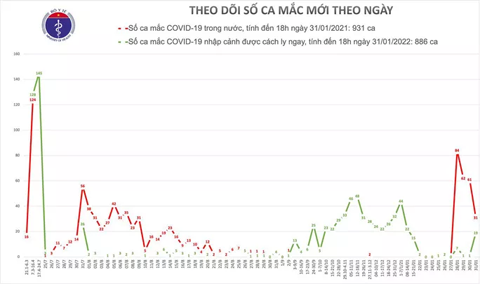 Bộ Y tế chiều 31-1 cho biết trong 12 giờ qua, cả nước phát hiện thêm 36 ca mắc Covid-19 mới, trong đó có 19 ca nhập cảnh đang được cách ly và 17 ca lây nhiễm trong cộng đồng.
