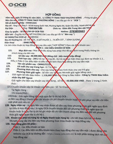 "Hồ sơ giả mạo được mô phỏng các điều khoản theo mẫu hợp đồng vay tại OCB. Tuy nhiên, thông tin về người đứng tên đại diện của ngân hàng đều sai lệch. Khách hàng sau khi cung cấp các thông tin sẽ được yêu cầu thanh toán theo dạng COD (giao hàng thu tiền) thông qua người giao hàng, bưu điện với chi phí từ 1,5 - 2,5 triệu đồng để nhận hợp đồng vay" - OCB cảnh báo.