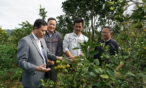 Chủ tịch UBND huyện Krông Bông Lê Văn Long (bìa trái) thăm mô hình trồng cây ăn trái tại thôn 4, xã Cư Kty. Ảnh: Khả Lê