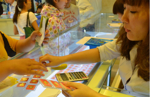 Hiện giá vàng thế giới quy đổi theo tỉ giá niêm yết chỉ khoảng 50,5 triệu đồng/lượng, thấp hơn vàng SJC trên 6 triệu đồng/lượng.