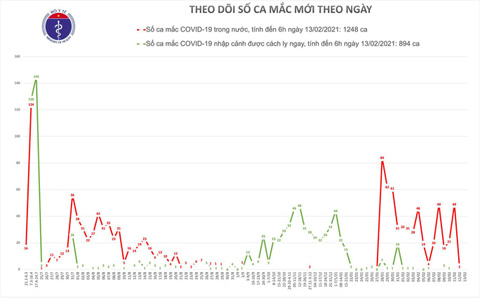 Bộ Y tế sáng 13-2 (mùng 2 Tết Tân Sửu) cho biết trong 12 giờ qua Việt Nam không phát hiện thêm ca mắc Covid-19 mới. Tổng số ca mắc ở nước ta vẫn là 2.142. người, trong đó Việt Nam có 1.248 ca mắc Covid-19 do lây nhiễm trong nước. Số lượng ca mắc mới tính từ ngày 27-1 đến nay là 555 ca.