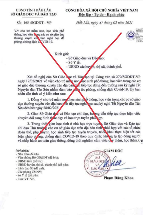 Chiều cùng ngày, trên mạng xã hội Facebook xuất hiện một công văn giả mạo Sở GD-ĐT tỉnh Đắk Lắk "về việc cho trẻ mầm non, học sinh phổ thông, học viên trong các cơ sở giáo dục thường xuyên của tỉnh nghỉ học để phòng chống dịch Covid-19".