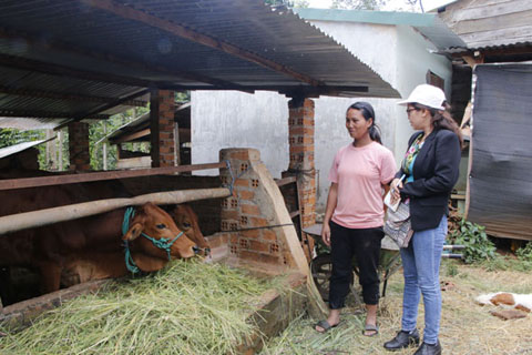 Gia đình chị H’Rưng Mlô (bên trái) phát triển chăn nuôi bò nhờ vốn vay NHCSXH.