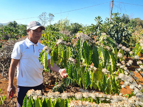 Ông Ama Bhi đi kiểm tra vườn cà phê tái canh năm thứ ba của gia đình