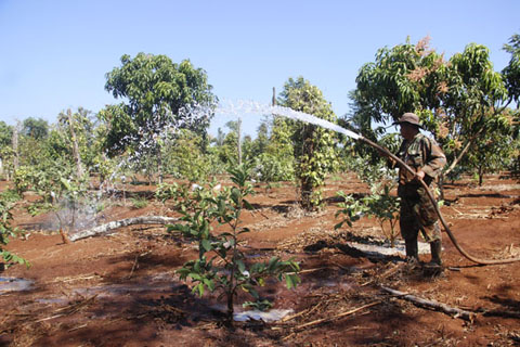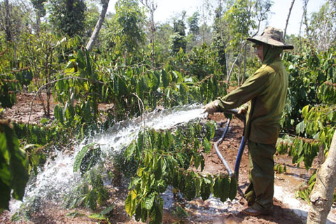 Anh Lê Công (tổ dân phố Thành Công, thị trấn Ea Pốk) tưới nước cho vườn cà phê.