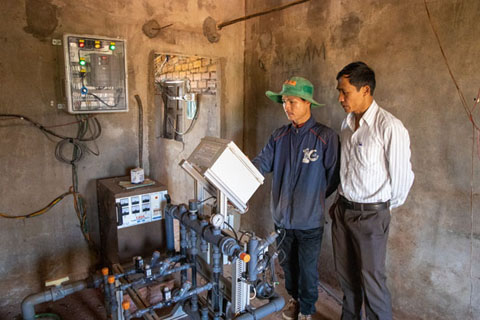 Anh Lê Quý ở thôn 3, xã Dliê Yang, huyện Ea H'leo (bên trái) cài đặt hệ thống tưới nhỏ giọt từ xa cho cây trồng.